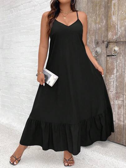 SHEIN LUNE 大码度假休闲纯色露背荷叶边下摆长款吊带连衣裙超长款女装 - 黑色 - 查看 1