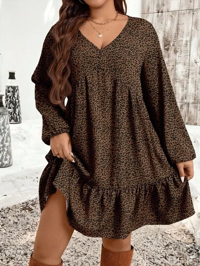 SHEIN LUNE 大码女式豹纹V领灯笼袖荷叶边下摆休闲连衣裙