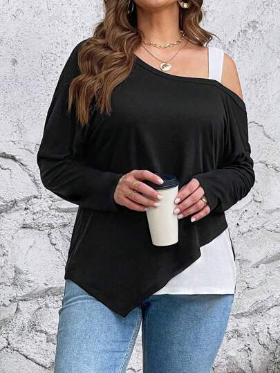 SHEIN LUNE 大碼雙色不對稱領T恤