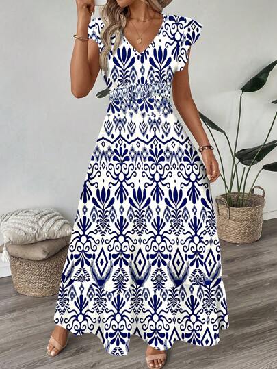 SHEIN LUNE 褶皱荷叶边飘逸袖收腰喇叭豹纹连衣裙,休闲度假优雅飘逸波西米亚风女装,适合春夏季 - 彩色 - 查看 1