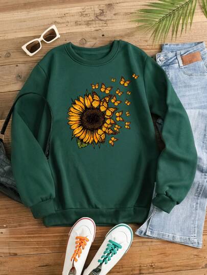 INAWLY 向日葵與蝴蝶印花保暖襯裡運動衫 - 墨綠色 - 查看 1