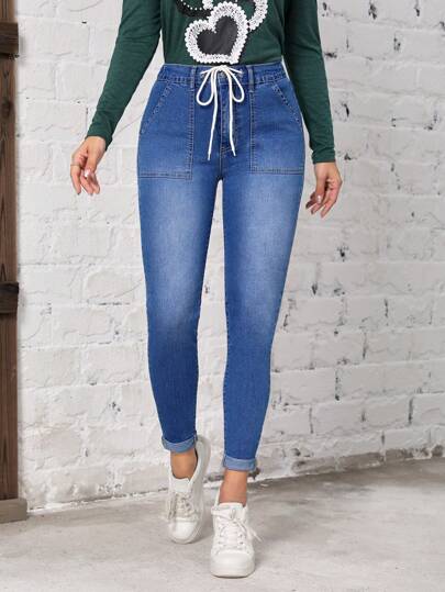 SHEIN EZwear 前繫帶斜口袋緊身牛仔褲 - 藍色 - 查看 1
