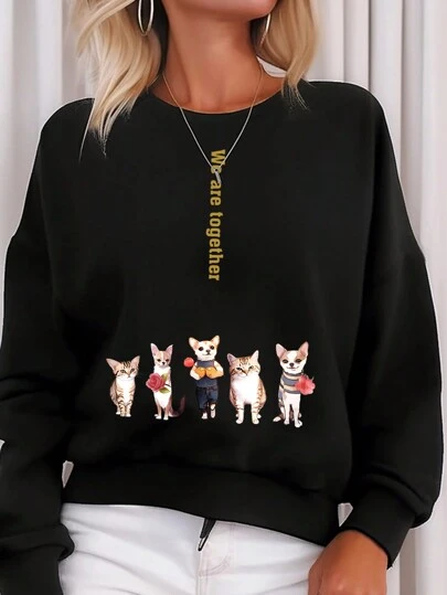 SHEIN LUNE 女性貓咪印花運動衫 - 黑色 - 查看 5