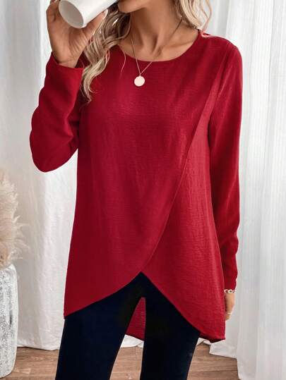 SHEIN LUNE 女士圓領不對稱下擺襯衫 - 酒紅色 - 查看 1