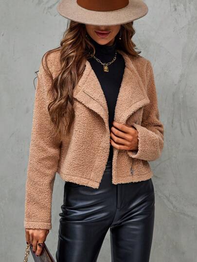 SHEIN LUNE 拉鏈開襟毛絨夾克 - 棕色 - 查看 1