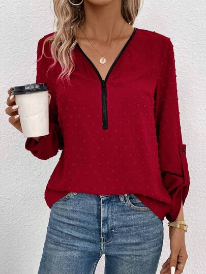 SHEIN LUNE 拉鍊半釦紋點織物恤衫,卷起袖子款式