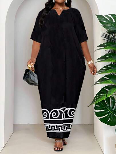 SHEIN Lady 春夏秋冬优雅黑白编织缺口长袍连衣裙加大码连衣裙邮轮装女装 - 彩色 - 查看 1