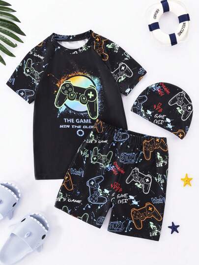 SHEIN Leap Crew 3入組男童休閒純色短袖T恤加印花設計,配有短褲、帽子和游泳裝 - 黑色 - 查看 1