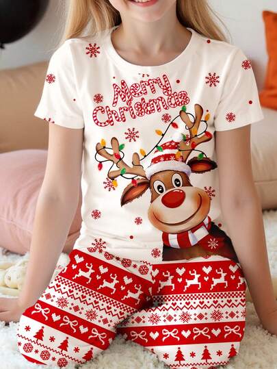 SHEIN Leap Crew 圣诞系列,复古红色圈圈绒鲁道夫,雪花费尔岛图案印花,少女休闲简约保暖柔软长袖睡衣套装,适合秋冬居家穿着,圣诞睡衣派对,女孩睡衣套装,红色圣诞睡衣,舒适合身单人睡衣,短袖舒适合身两件套睡衣,圣诞睡衣