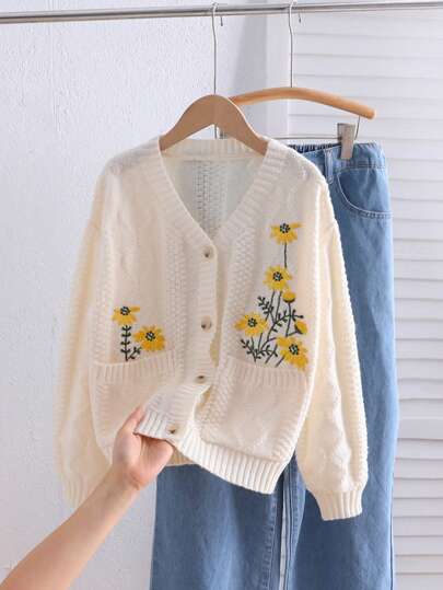 SHEIN Leap Crew Tween 女童休闲针织 V 领长袖刺绣开衫 - 杏色 - 查看 1