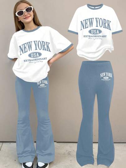 SHEIN Leap Crew 青少年女孩休闲简约短袖和长裤两件套,夏季 - 彩色 - 查看 1