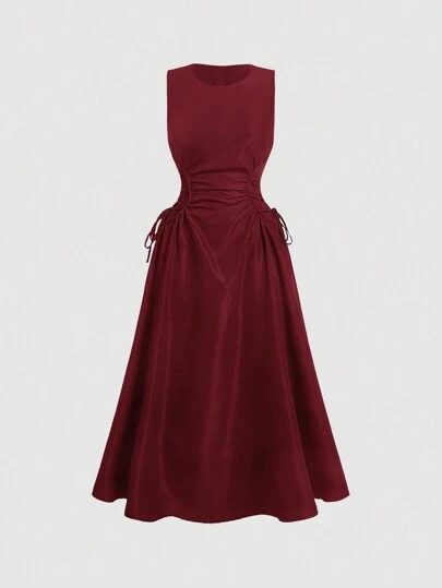 SHEIN MOD 黑色约会之夜 侧交叉系带纯色褶饰长裙 - 酒紅色 - 查看 1