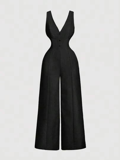 SHEIN MOD 深V领无袖束腰阔腿黑色连体裤 - 黑色 - 查看 1