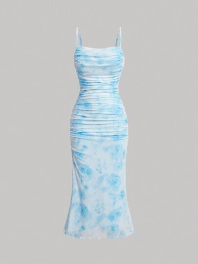 SHEIN MOD 印花褶邊網紗吊帶洋裝 - 藍色 - 查看 1