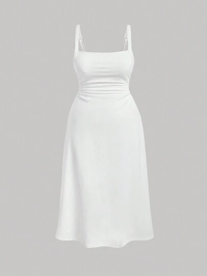 SHEIN MOD 大碼素色褶邊吊帶洋裝 - 白色 - 查看 1