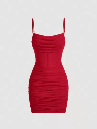 SHEIN MOD 红色紧身鱼骨派对约会之夜纯色褶饰网眼吊带连衣裙 - 紅色 - 查看 1