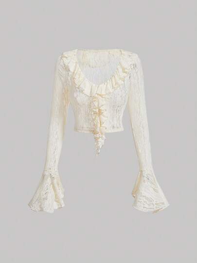 SHEIN MOD 休閒鈕扣 揉皺純色女士上衣 - 米色 - 查看 1