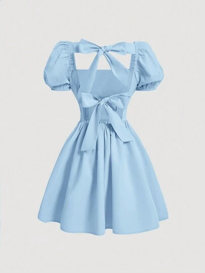 SHEIN MOD 纯色后系蝴蝶结女式短款泡泡袖连衣裙 - 藍色 - 查看 1