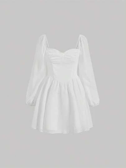 SHEIN MOD 雞心領口燈籠袖胸部褶皺連衣裙 - 白色 - 查看 1