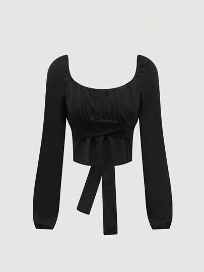 SHEIN Unity 綁帶實色短上衣 - 黑色 - 查看 1