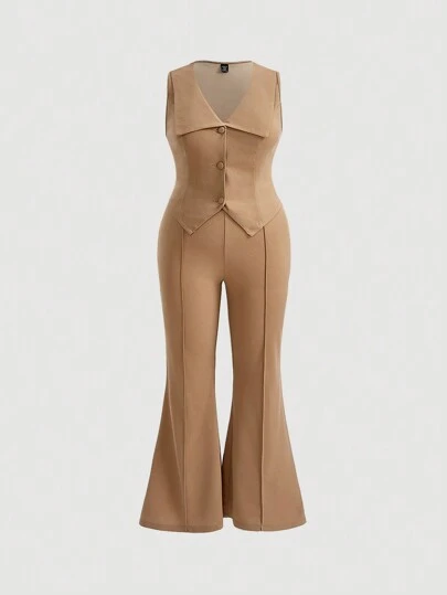 SHEIN MOD 復古合身翻領背心和喇叭褲大尺碼2件套裝 - 卡其色 - 查看 1