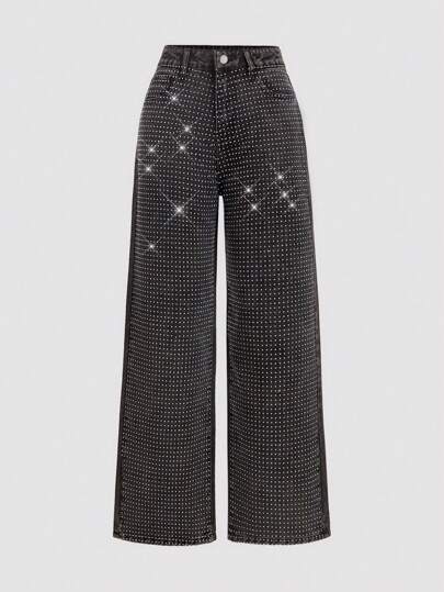 SHEIN MOD 女士休闲日常牛仔裤,宽松牛仔裤,牛仔女郎,圣帕特里克节,女士街头服饰,闪亮宽松牛仔裤,舞会裤,阔腿裤,西部风 - 黑色 - 查看 1