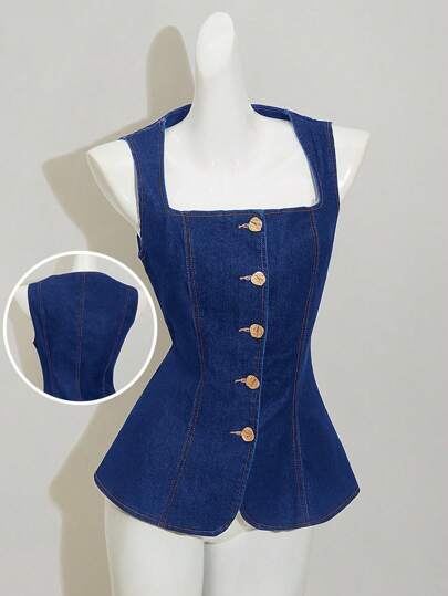 SHEIN MOD 女式休闲前扣无袖牛仔衬衫,夏季