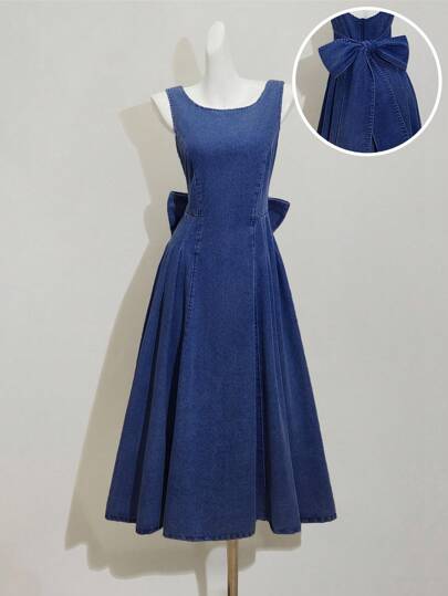 SHEIN MOD 女士牛仔连衣裙,休闲修身无袖蝴蝶结,蓝色
