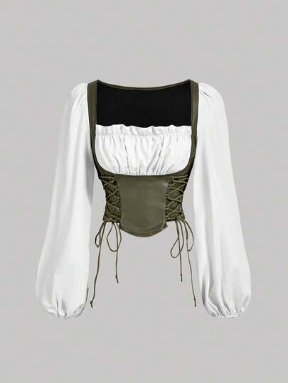 SHEIN MOD 女士绿白PU拼接灯笼袖衬衫 - 軍綠色 - 查看 1