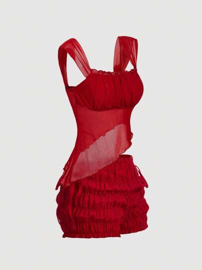 SHEIN MOD 女式红色两件套:不对称下摆修身上衣和泡泡细节低腰短裤,度假、生日、海滩、热带、派对、可爱、夏季、早午餐、春假、休闲、女式两件套 - 酒紅色 - 查看 1