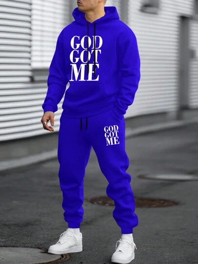 Manfinity Roughcore 男士字母印花抽绳连帽衫和运动裤套装,秋季服装 - 藏蓝色 - 查看 1