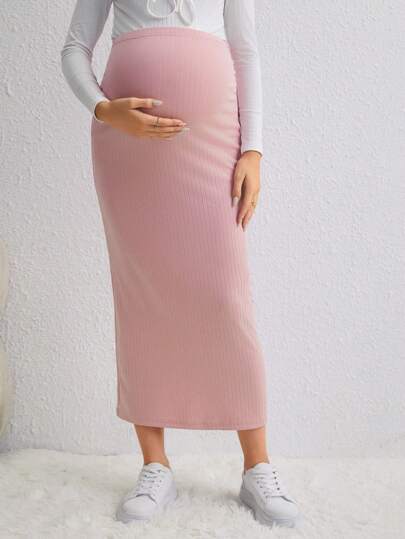 SHEIN 孕婦可調節腰圍羅紋針織鉛筆裙 - 粉色 - 查看 1