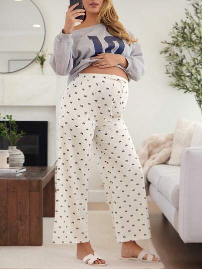 SHEIN 孕妇蝴蝶结印花抽绳腰带口袋阔腿宽松休闲裤 - 卡其色 - 查看 1