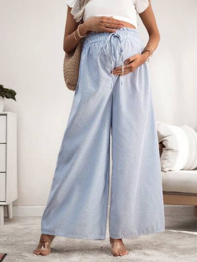 SHEIN 孕妇休闲条纹荷叶边抽绳腰阔腿裤 - 藍白色 - 查看 1