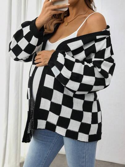SHEIN 孕妇棋盘格图案休闲针织开衫,长袖,冬季 - 黑與白 - 查看 1