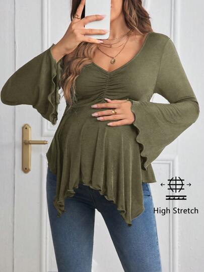SHEIN 孕妇荷叶边袖褶皱生菜边 Y2k 风格 T 恤,黑色长袖紧身孕妇上衣,秋冬 - 軍綠色 - 查看 1