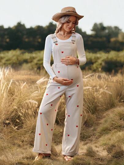 SHEIN 孕妇心形图案无袖休闲宽松直筒连体裤 - 杏色 - 查看 1