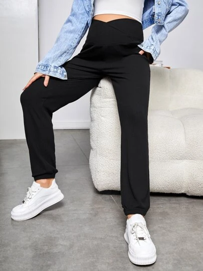 SHEIN 孕婦高腰斜口袋長褲 - 黑色 - 查看 1