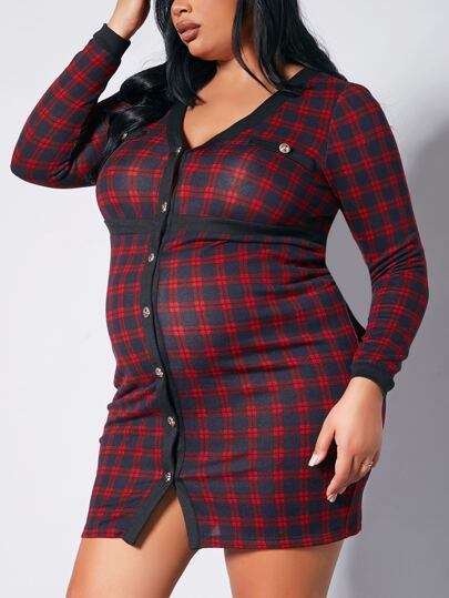 SHEIN 孕婦格紋印花前紐扣緊身連衣裙 - 酒紅色 - 查看 1