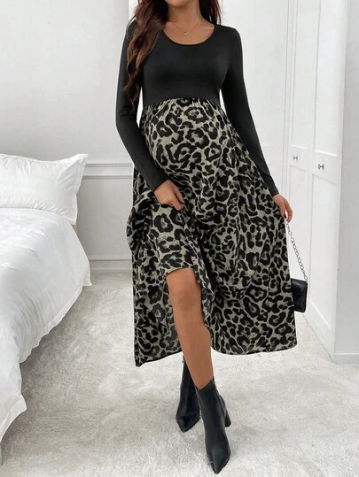 SHEIN 孕妇圆领插肩袖豹纹拼布时尚连衣裙 - 灰色 - 查看 1