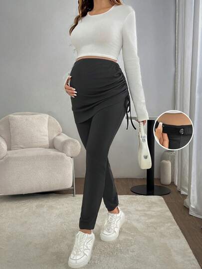 SHEIN 孕妇纯色可调节腰部褶皱二合一紧身裤 - 深灰色 - 查看 1