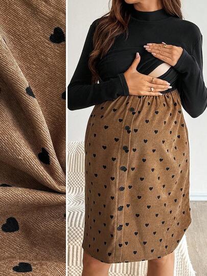 SHEIN 孕妇立领长袖拼布心形印花纽扣设计休闲哺乳连衣裙 - 彩色 - 查看 1