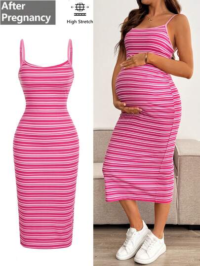 SHEIN 孕妇条纹印花修身时尚吊带连衣裙 - 粉色 - 查看 1
