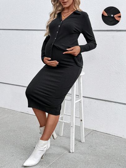 SHEIN 孕婦假期女士2入組黑色上衣/襯衫搭配可調節彈性腰裙,修身孕婦連身裙 - 黑色 - 查看 1