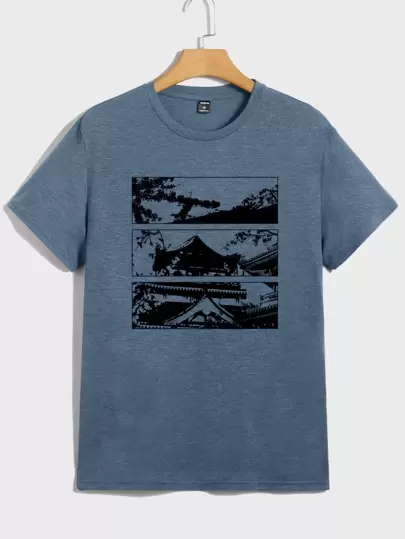 Manfinity VCAY 男士圖案印花T恤 - 霧霾藍 - 查看 1