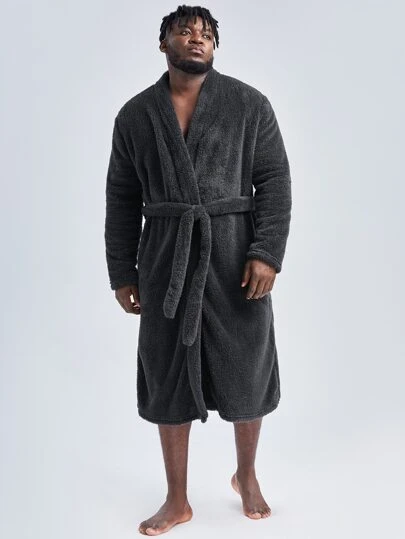 男士開門襟腰帶絨毛休閒服睡袍 - 深灰色 - 查看 1