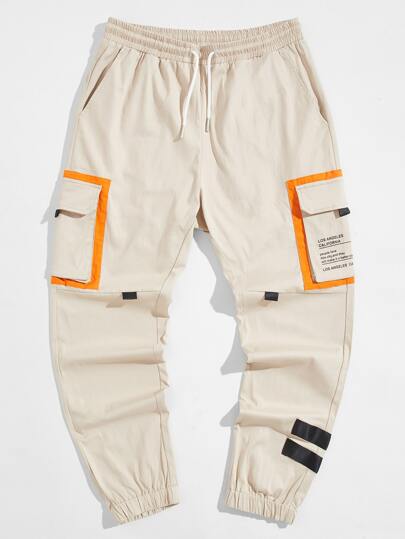 Manfinity VCAY 男士標語圖案翻蓋口袋抽繩褲子 - 卡其色 - 查看 1