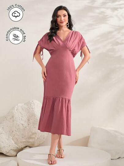 Modelyn 優雅抽繩 荷葉邊純色女士連衣裙 - 藕粉色 - 查看 1