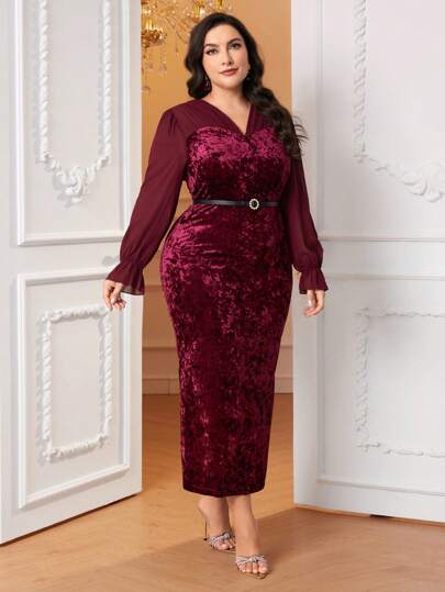 Modelyn 勃艮第红色加荷叶边袖开衩后背天鹅绒连衣裙(无腰带) - 酒紅色 - 查看 1