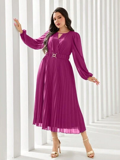 Modelyn 大碼鎖眼領燈籠袖繫腰帶洋裝 - 中紫紅色 - 查看 1